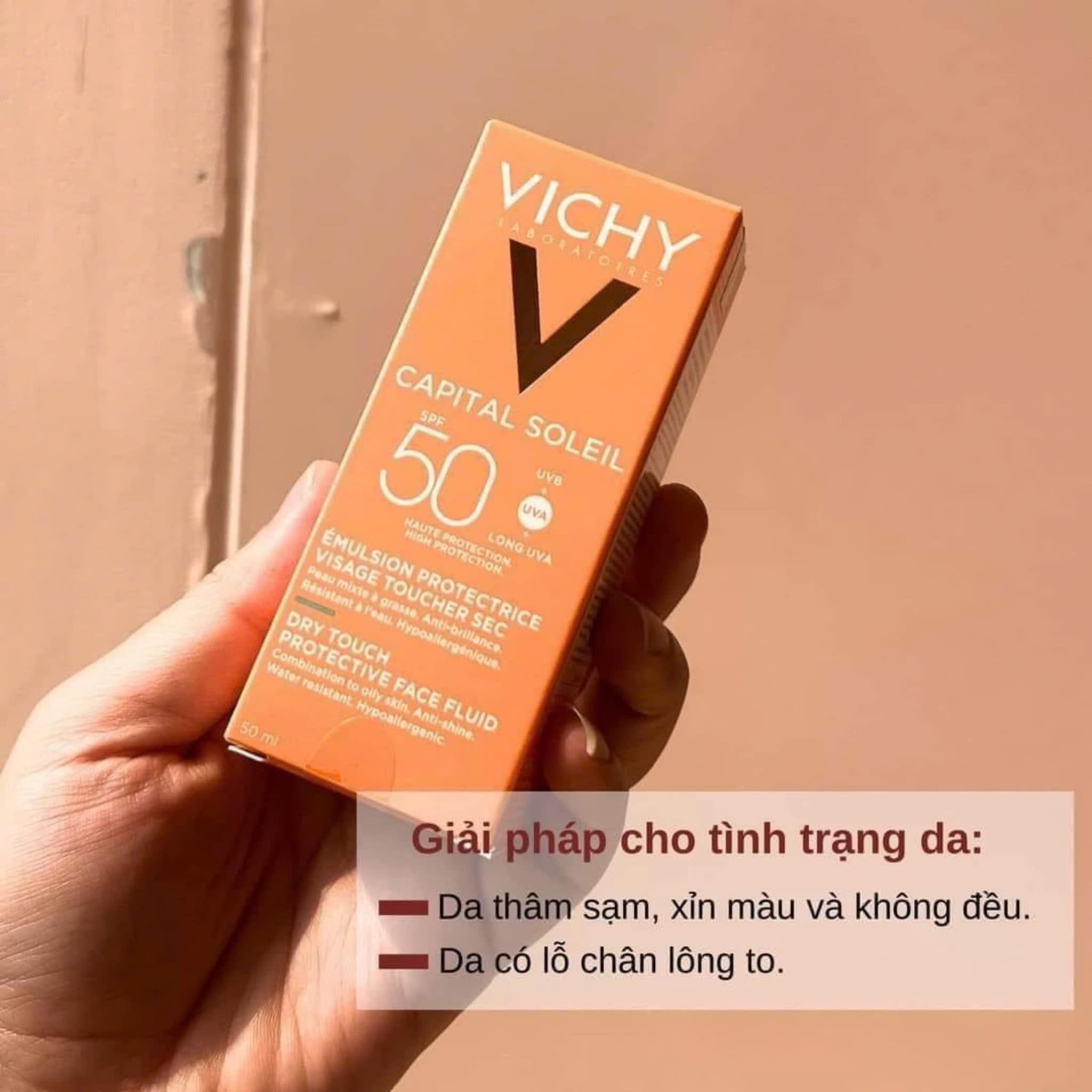 - Kem chống nắng Vichy SPF 50 Capital Soleil Anti-Shine sử dụng công nghệ màng lọc màng lọc Mexoryl bảo vệ da trước tác hại của tia UVA, UVB 1 cách toàn diện. Thành phần Acid Hyaluronic, Vitamin E và nước khoáng giúp cung cấp độ ẩm cho da, làm dịu da khi tiếp xúc trực tiếp với ánh nắng mặt trời.