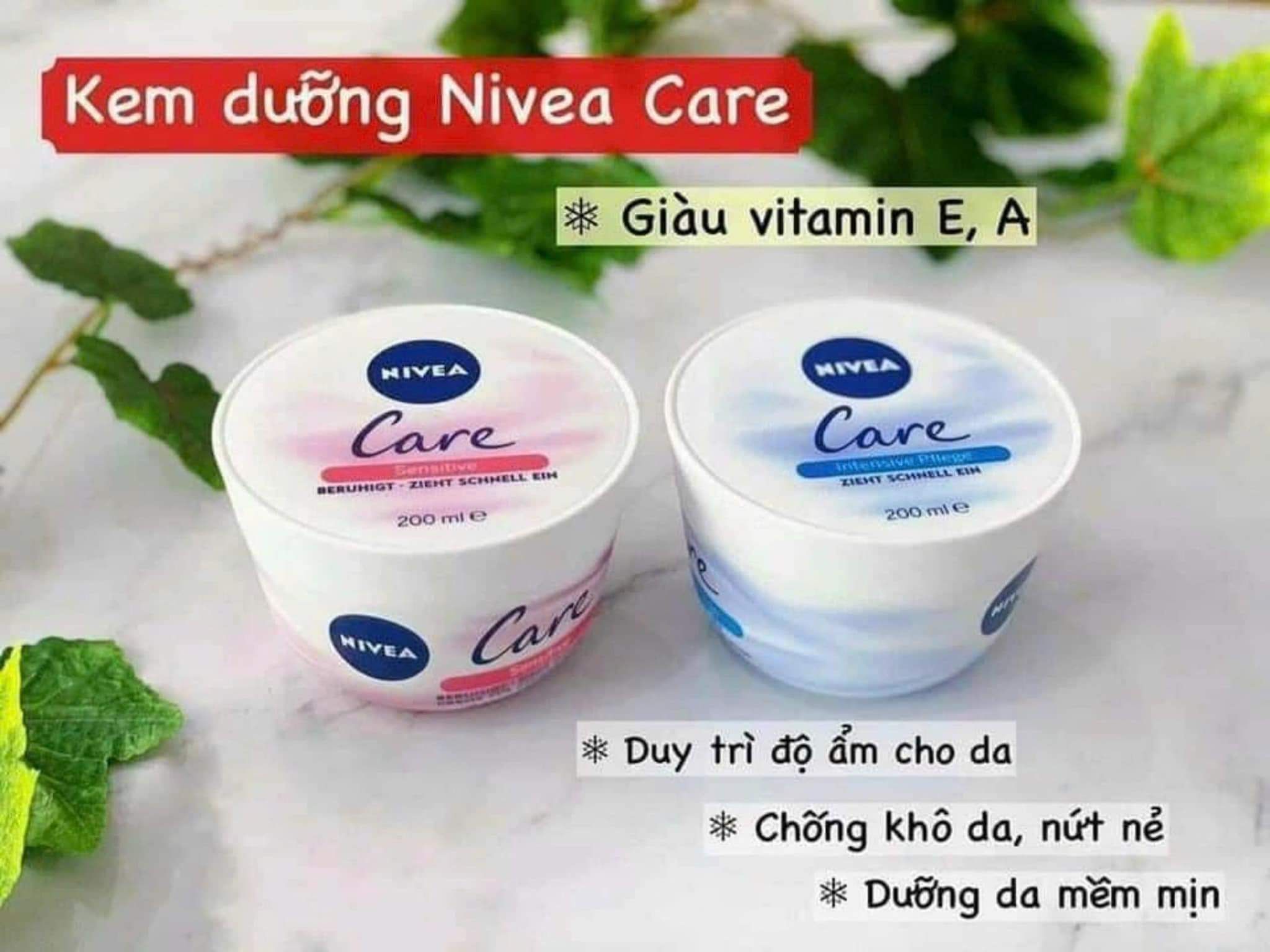 Kem dưỡng da Nivea Care với công thức đặc biệt dưỡng ẩm chuyên sâu cho làn da. Vitamin E, A và các dưỡng chất thiết yếu cùng với công nghệ sản xuất tiến tiến nhất giúp kem thẩm thấu sâu, tái tạo, cung cấp và duy trì độ ẩm, phục hồi làn da khô, mất nước (bởi da khô dễ dẫn tới tình trạng da lão hóa nhanh, hình thành nếp nhăn)