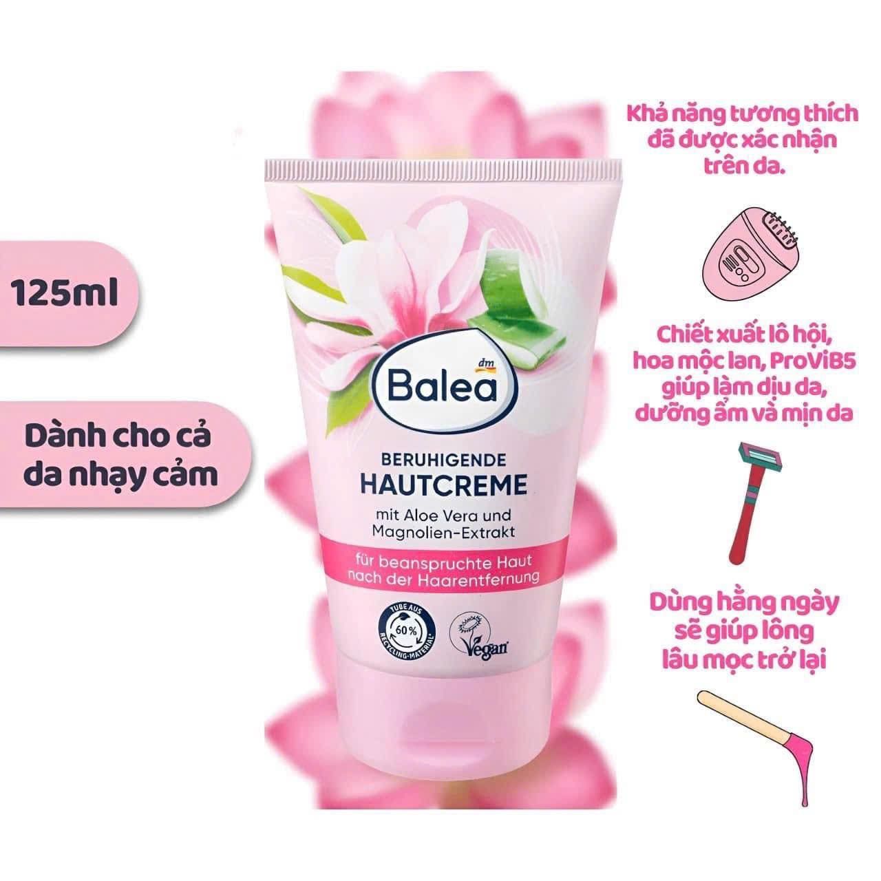 Kem dưỡng sau wax và ức chế lông mọc Balea có chứa chiết xuất lô hội, hoa mộc lan, pro-vitamin B5 giúp làm dịu vùng da vừa wax và dưỡng da mềm mịn, dưỡng ẩm cho da suốt cả ngày. Không những thế, dùng hàng ngày sẽ giúp lông lâu mọc trở lại hơn. Sản phẩm thích hợp với cả da nhạy cảm.