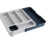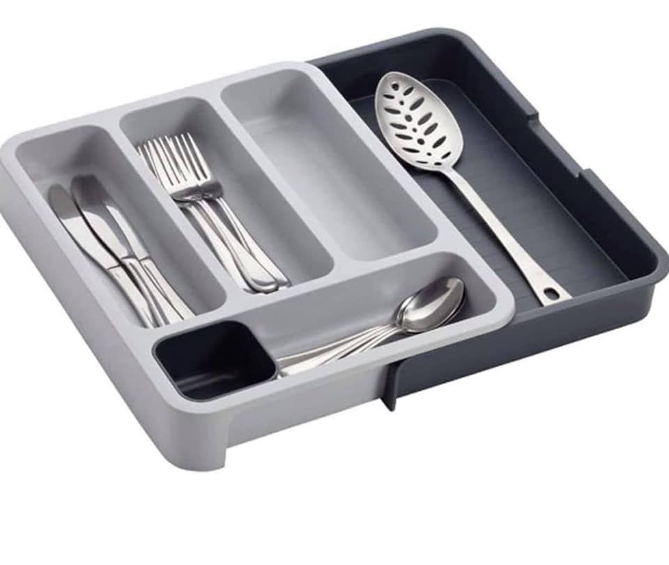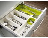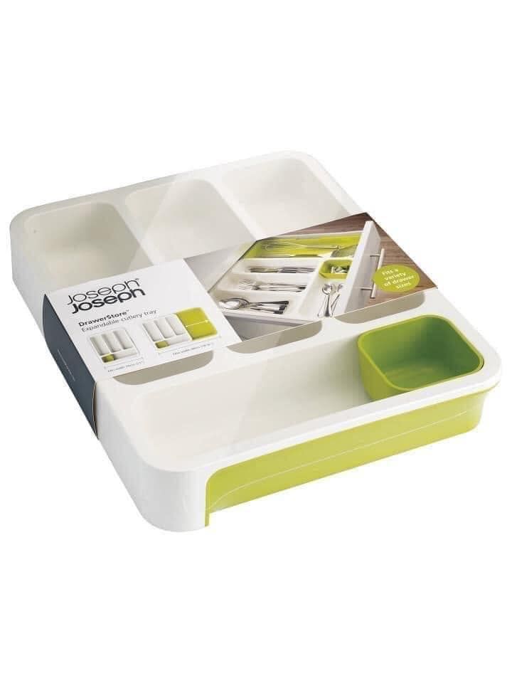 Khay được thiết kế với khả năng mở rộng tùy chỉnh, phù hợp với các loại ngăn kéo có kích thước khác nhau từ lớn tới nhỏ, có 4 khoang sâu cạnh bao để các loại dao, kéo, dĩa, thìa cũng như 1 khoang lớn để chứa các loại dụng cụ và dao lớn hơn và 1 đĩa nhỏ cầm tay có thể di chuyển trong khoang để chứa các vật dụng nhỏ.