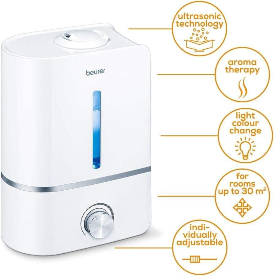 - Máy tạo độ ẩm LB45 Beurer sẽ giúp bạn giảm thiểu các vấn đề về sức khỏe gây ra bởi không khí khô hanh. Điển hình như: viêm xoang; khô môi; nứt nẻ môi; chảy máu mũi…