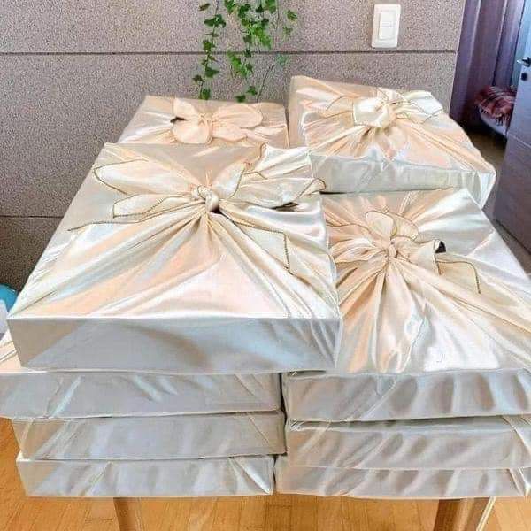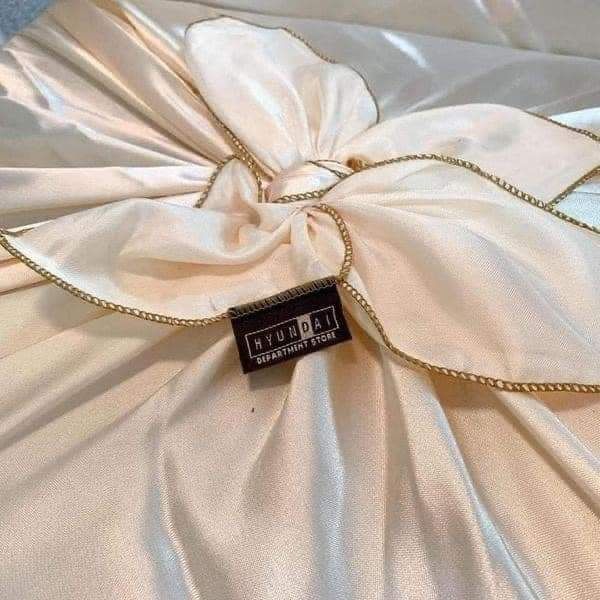 Hộp đỏ, khăn lụa vàng nhẹ có thêu chữ “Huyndai Department Store”. Đẳng cấp sang trọng vô cùng. Biếu sếp, biếu quý nhân rất xịn ạ.