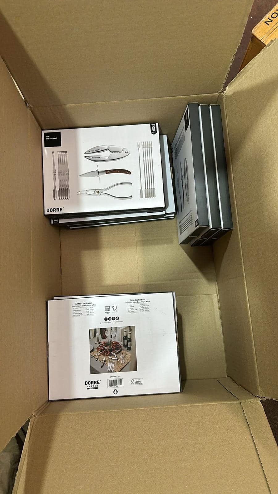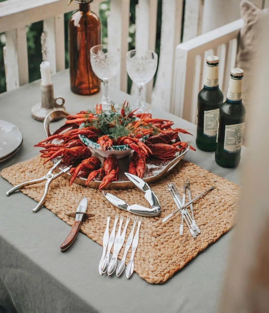 Bộ hải sản Skai 15 món từ thương hiệu Swedish Dorre bao gồm mọi thứ cần thiết để ăn tôm hùm, cua hoặc tôm càng - bao gồm: một con dao hàu, một kẹp càng cua, một chiếc kìm kẹp, sáu nĩa ăn tôm càng và sáu nĩa cua.