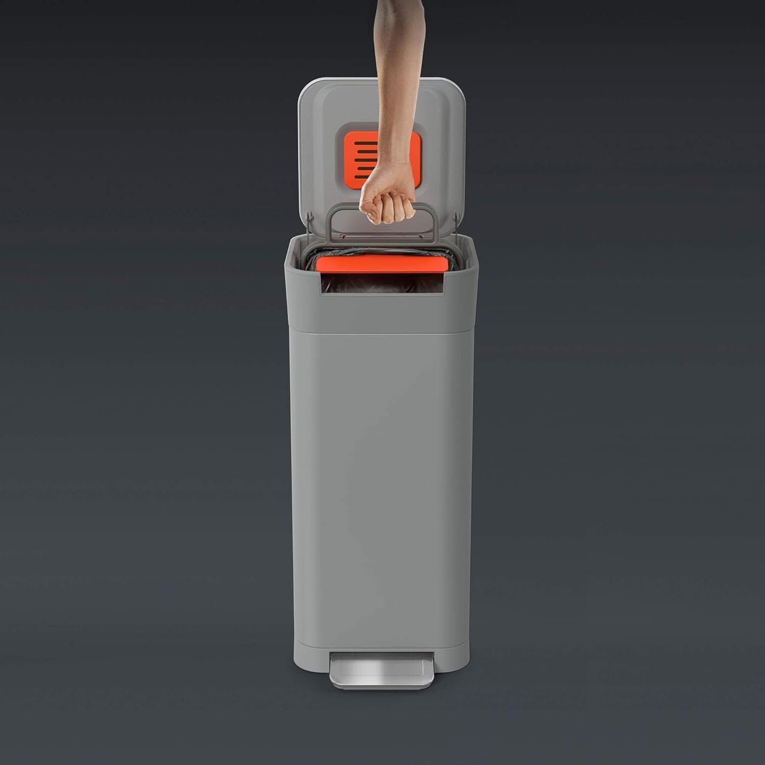 - Thùng rác Titan của Joseph Joseph không phải chỉ là một chiếc thùng rác bình thường mà nó còn có một hệ thống tiện ích được cấp bằng sáng chế để nén rác một cách vệ sinh.